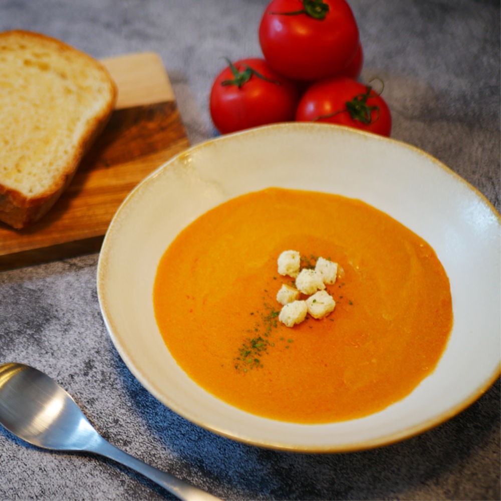 日本有数のトマトの産地・竹田市荻町で育った完熟トマトを使用しています。「大分のアル プス」と呼ばれる高原台地で育ったトマトは、白水の滝でも知られる清らかな水と空気のな か昼夜の寒暖差に鍛えられ、ほどよい酸味と甘みを兼ね備えているのが特徴。リコピンたっ ぷりの身体も喜ぶトマトでつくったスープが彩り豊かに食卓に花を添えてくれます。大分県産椎茸ときのこのクラムチャウダー