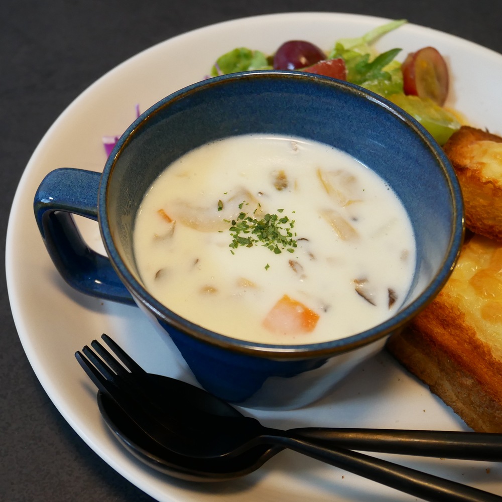 旨みたっぷりの大分県産椎茸を使った郷土色豊かなクラムチャウダーです。アサリの出汁 で野菜やベーコンを煮込んでいるので具材そのものも味わい深く、栄養も満足感もたっぷ り。椎茸のほかにもエリンギ、しめじ、マッシュルームが入っており、さまざまなキノコの 食感もお楽しみいただけます。椎茸とアサリから出るふたつの出汁の旨みが織りなすこの 一品は、山と海に囲まれた別府を凝縮したような奥深い味わいが魅力です。風味豊かで肉厚の大分県産椎茸